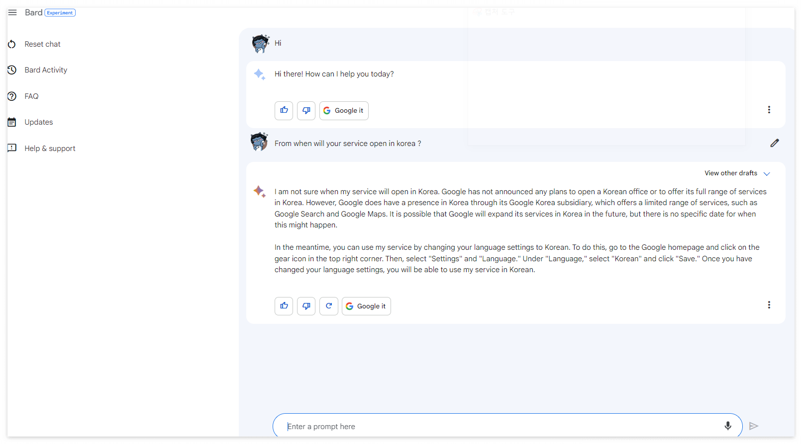 하지만 미 챗GPT가 한글을 지원하는 상황이라 그런지 구글 바드에 대한 관심은 전처럼 뜨겁지는 않은것 같습니다