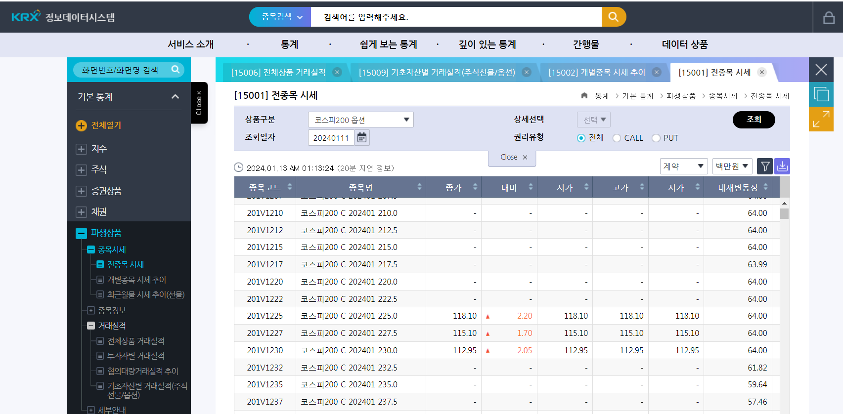 2024년1월 11일 만기 된 1월 물 전체 옵션종목의 거래정보를 아래그림과 같이 조회해서 엑셀로 다운로드하였다.