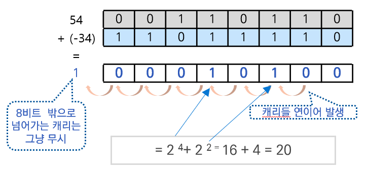 | 4) 54 – 34 를 => 54 + (-34 ) 의 형태로 연산 - 이때 8비트로 처리할경우는 8비트를 벗어나는 캐리는 무시한다는점. - 만약 16비트로 처리하면 계속 캐리가 발생해서 올라가겠지 ^^ |