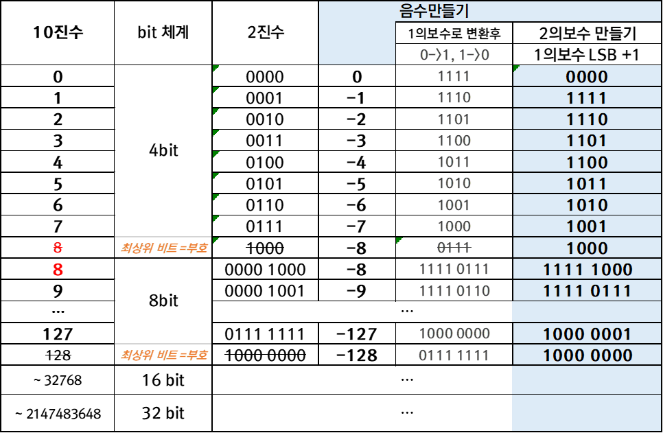 그리고 음수표현하려고 하는 것이니 당연히 최상위 비트(MSB) 는 부호를 나타내는 비트로 사용한다는 것을 기억해야 한다.