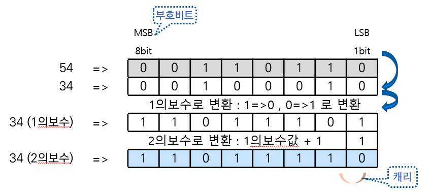| 3) 뺄셈대상 34를 음수값으로 변환 (이를 위해 2의보수로 변환) ① 먼저 1의보수로 바꾸고 ② 2의보수로 변환 (1의보수에 1을 더해서) |