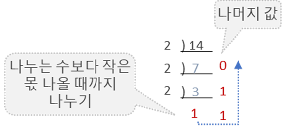 | 최종 몫과 나머지 부분을 밑에서 위로 화살표 순으로 연결 => 1 1 1 0 |