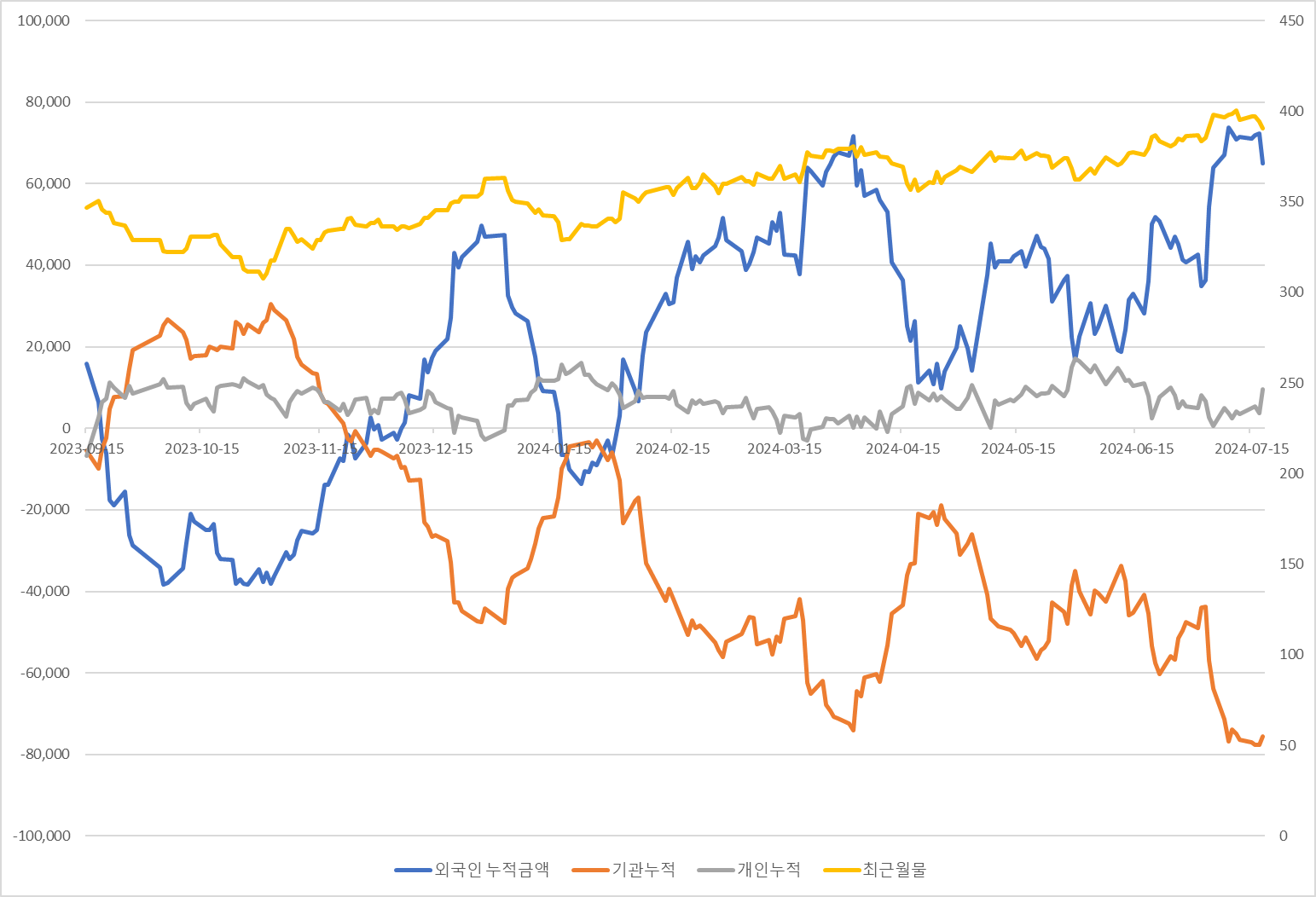 누적액은 어느 시점을 시작으로 누적하느냐에 따라 수치가 달라지기 때문에 약 1년 전부터의 최근월물 기준의 데이터를 가지고 차트를 그려보니 또 다른 상황에 그려진다.
