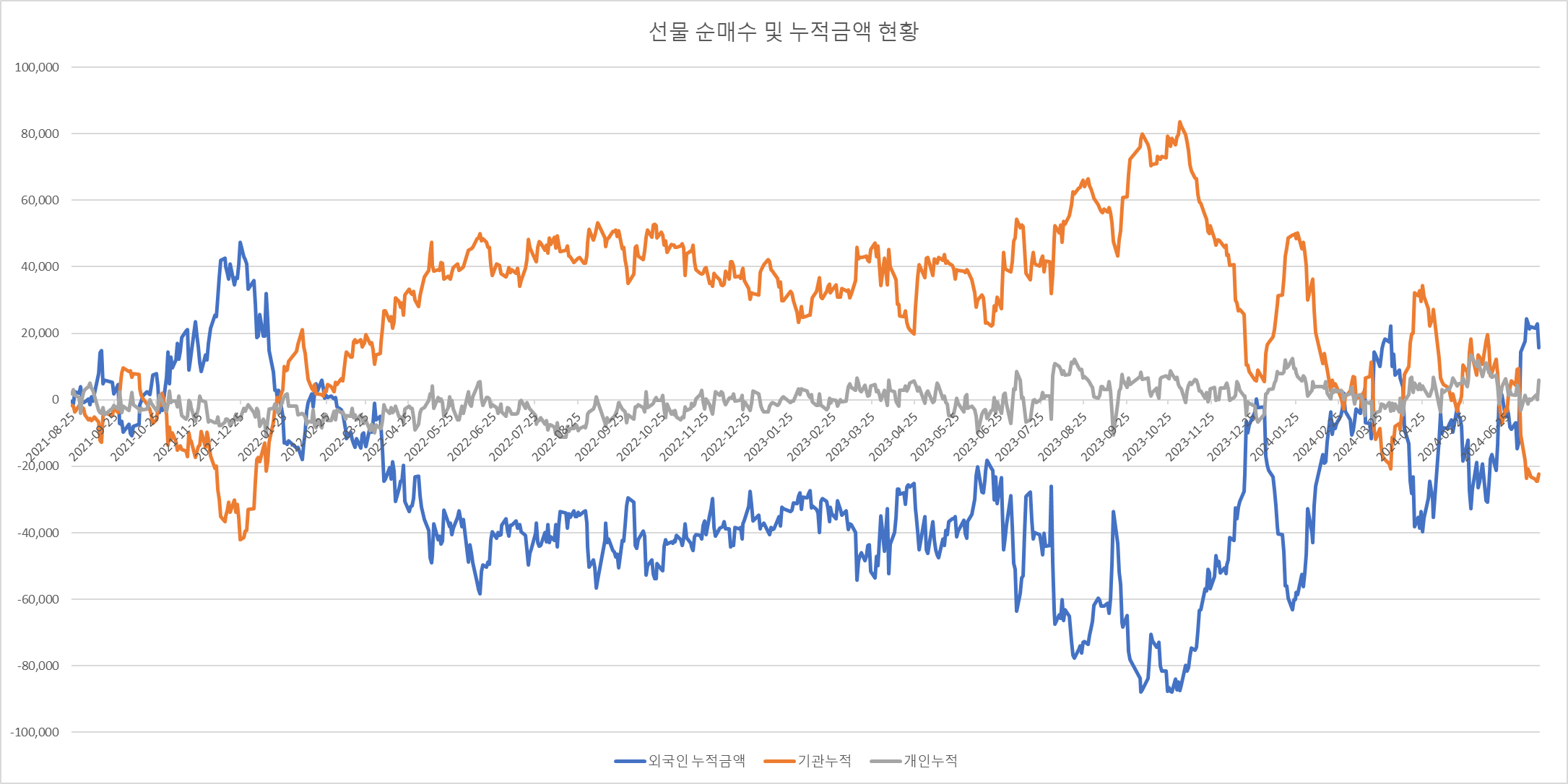 2018.8.25 일부터 2024.7.18일까지의 국내 코스피 200 지수선물에 대한 외국인, 기관, 개인의 수급현황을 조사해 보았다.