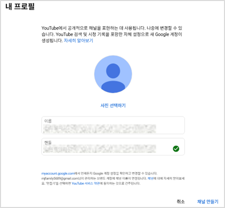 유튜브 닉네임과 Gmail 이름이 연결 브랜드에 맞는 프로필 및 설정 가능