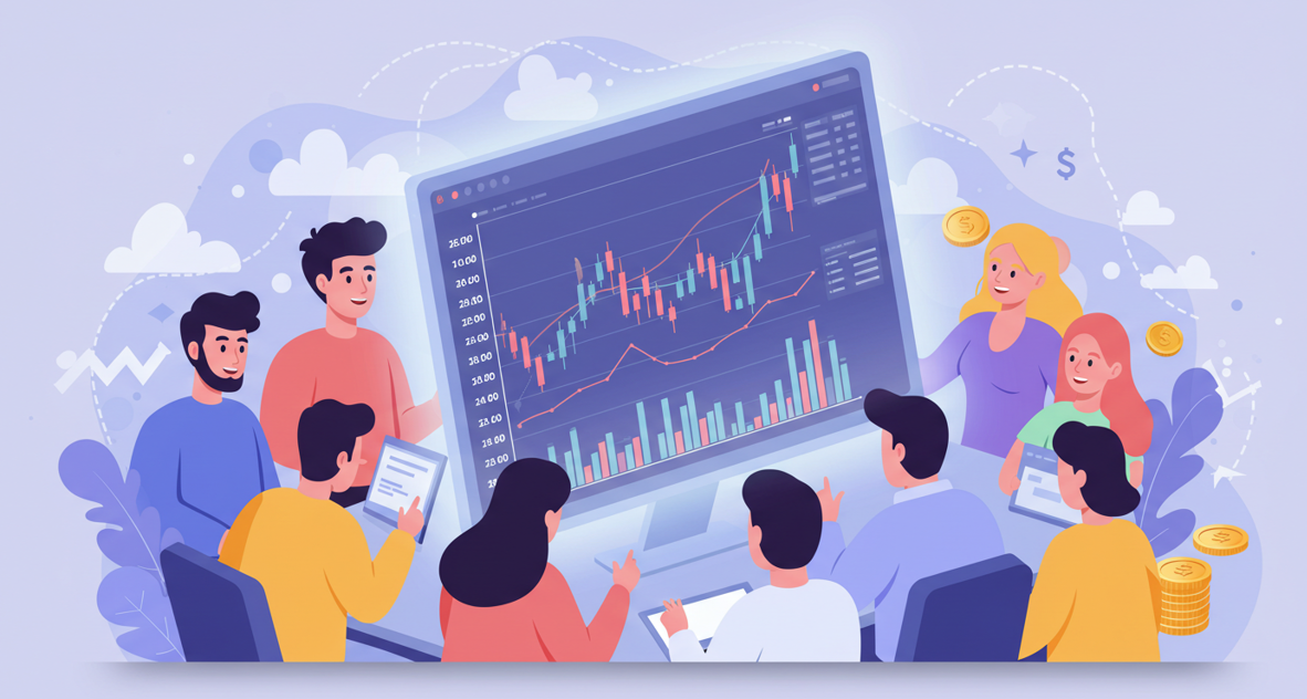 | Draw an image for a YouTube banner, size 1920 X 1080, with a simple and humorous feel, depicting a profit-oriented options trading analysis group. |