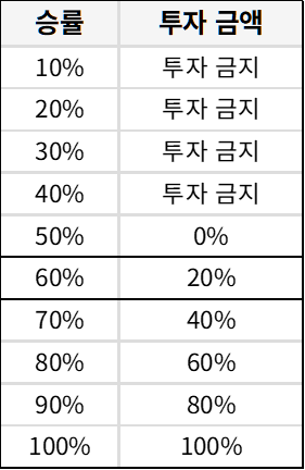 이것은 승리할 확율이 60% 이고 순수익의 비율이 100% 인경우에 나오는 결과값이다.