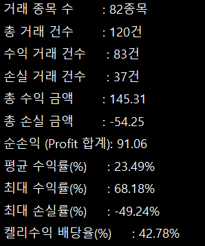 승률 68%, 평균수익률이 23%이지만 켈리방정식을 적용해서 투자배분하기에는 수익 배당률이 너무 낮다.