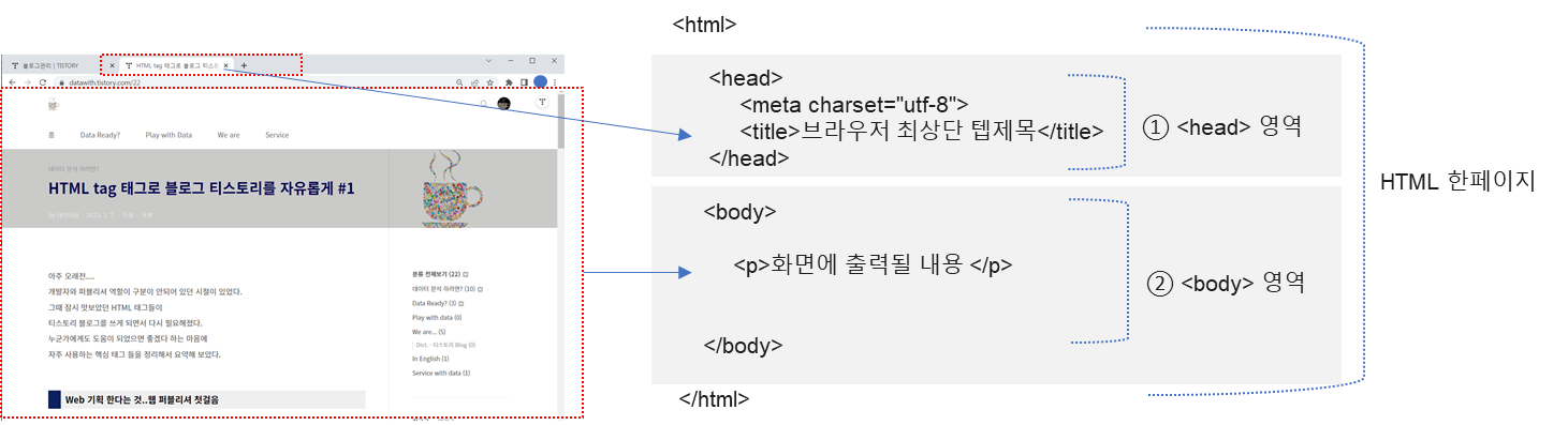 - body 영역 : 실제로 웹 브라우저 화면에 나타나는 내용을 작성하는 영역