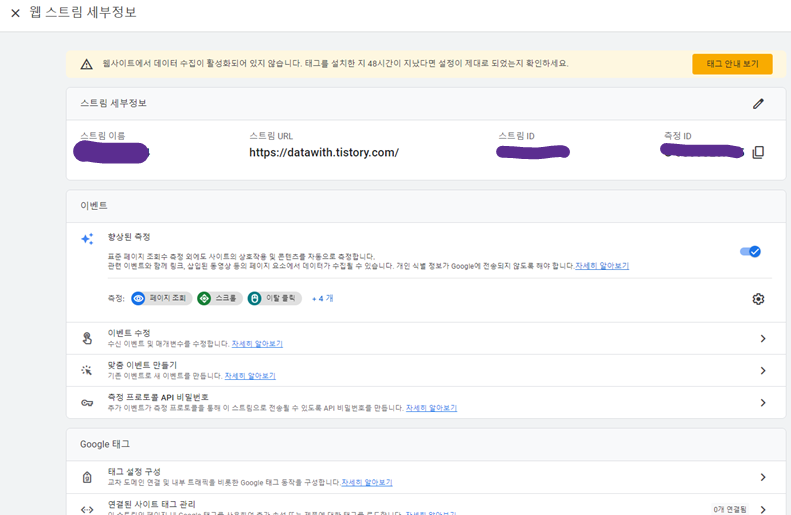 5) 데이터 스트림이 설정되었습니다! 튜토리얼의 뒷 단계에서 측정 ID를 이용합니다.