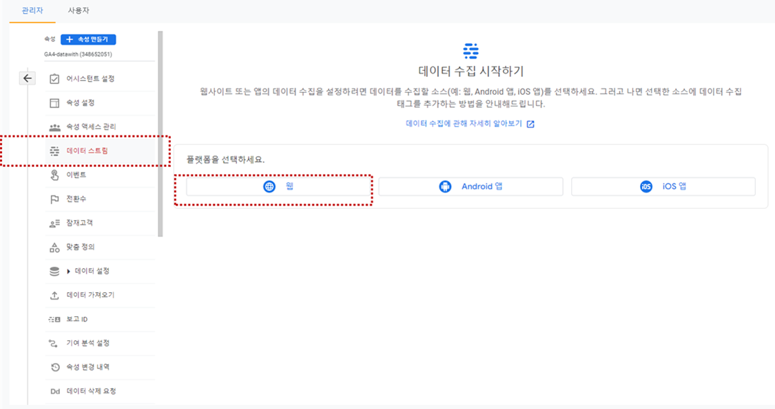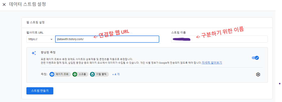 3) 웹 URL을 에널리틱스와 연결하는 작업 : 데이터스트림 - 웹 클릭
