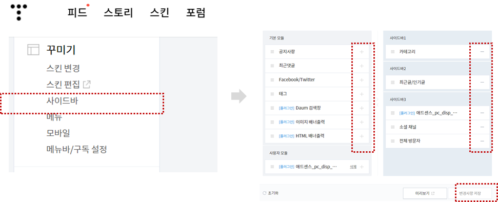 1) 사이드바 클릭 -> 우측화면에서 +버튼과 - 버튼을 이용하여 우측 사이드바란을 구성