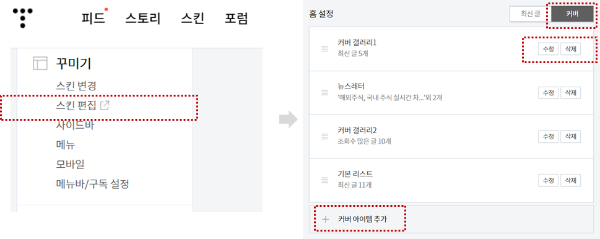 1) 스킨편집 클릭 -> 우측화면에서 홈설정 -> 커버 / 최신글 선택