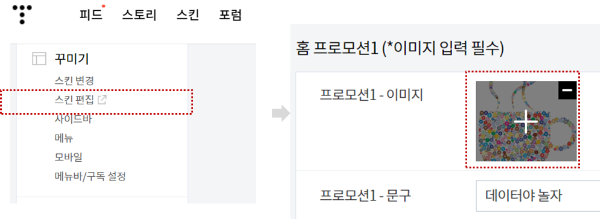 1) 스킨편집 클릭 -> 우측화면에서 홈프로모션 구역의 + 버튼 클릭