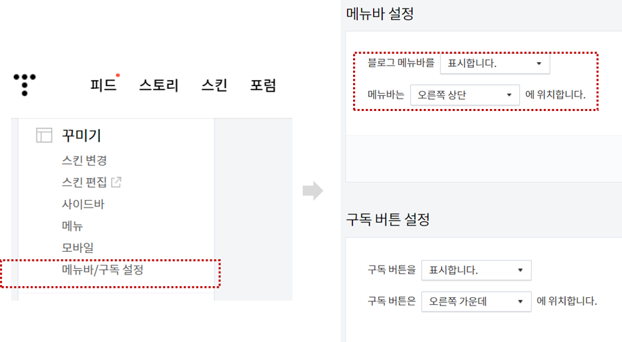 3) 메뉴바/구독 설정 클릭하고 오른쪽 화면에서 메뉴바를 표시합니다 선택