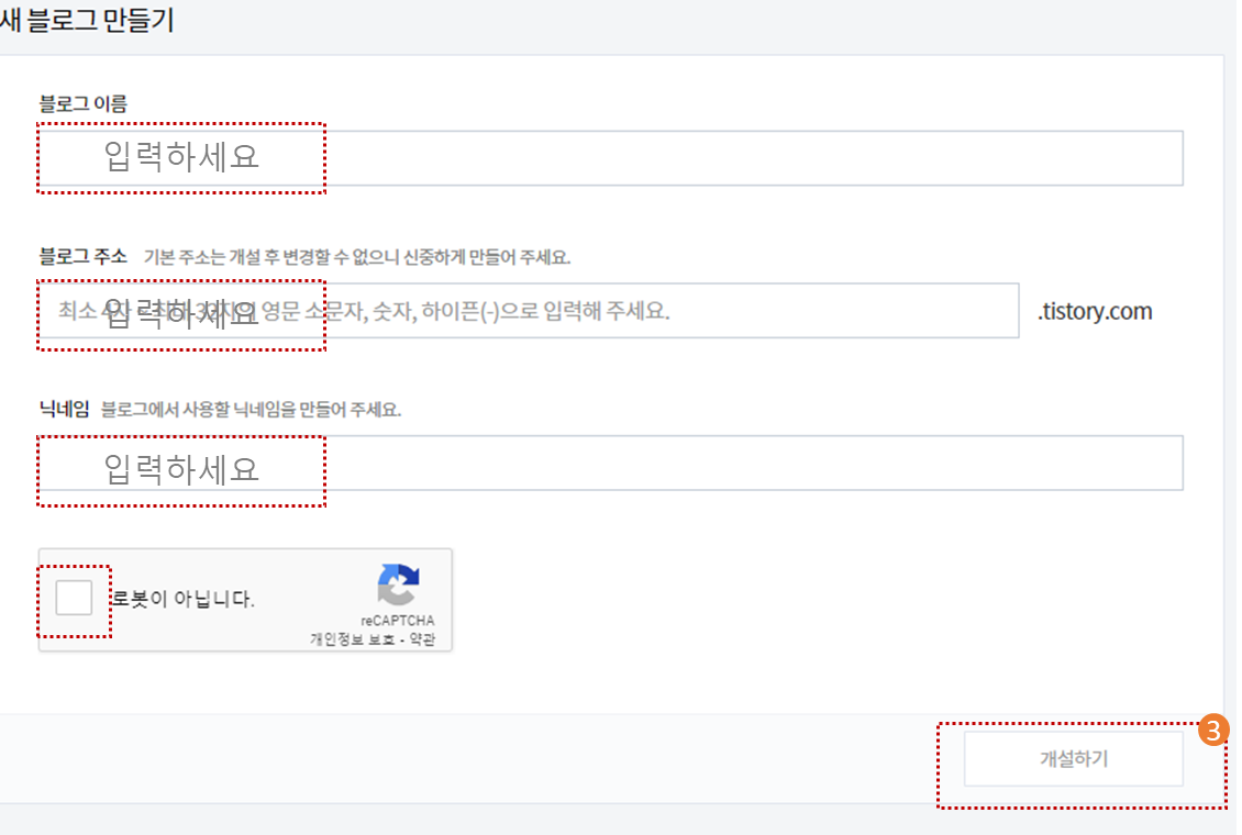 4. 처음 티스토리 계정 만들었을 때와 같이 블로그이름, 주소(URL)로 사용할 명칭, 닉네임 입력하고 로봇아님체크