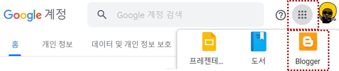 1. 구글 계정으로 로그인하고 -> 브라운저 상단 이름 옆에 점 9개 이미지 클릭 -> 마보 밑에 나오는 메뉴 중 블로거 선택