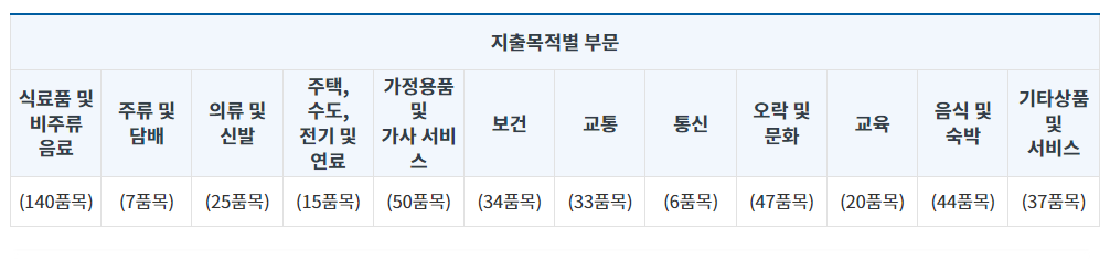 2020년 기준 소비자물가지수는 12개 대분류내 458개의 대표품목으로 이루어져 있습니다