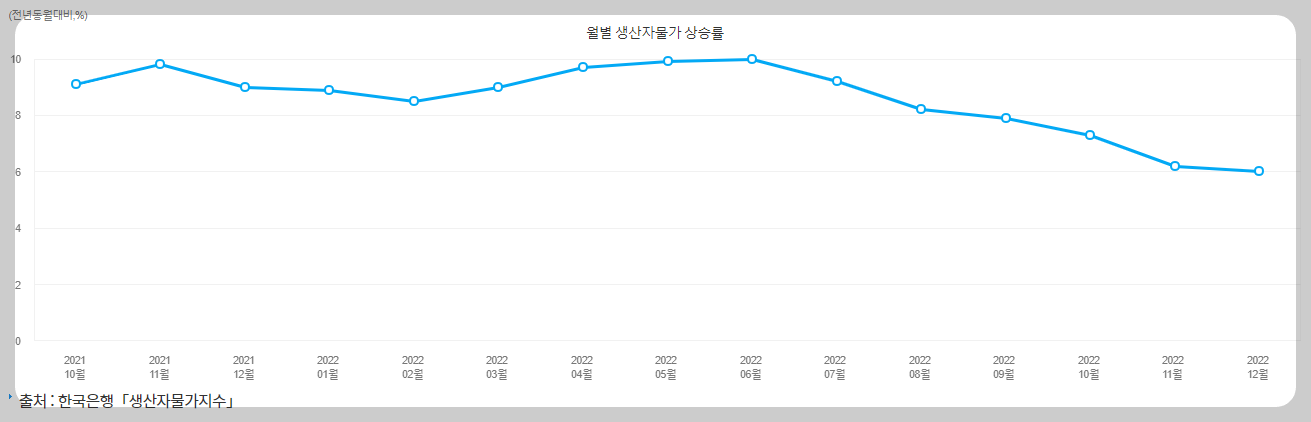생산자물가지수(PPI : Producer Price Index) 는 국내생산자가 국내시장에 출하하는 상품의 평균적인 가격변동을 측정하기 위해 작성되는 물가지수로 소비자물가지수 조사대상품목에 포함되지 않는 원재료·중간재·최종자본재 등도 조사대상에 포함되므로 생산자물가지수는 소비자물가지수보다 포괄범위가 좀 더 넓은 물가지수라 할 수 있습니다.