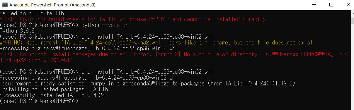 좀전에 다운로드 한 Ta-Lib.....파일을 pip 명령 실행하는 폴더에 옮겨놓고 다시 실행