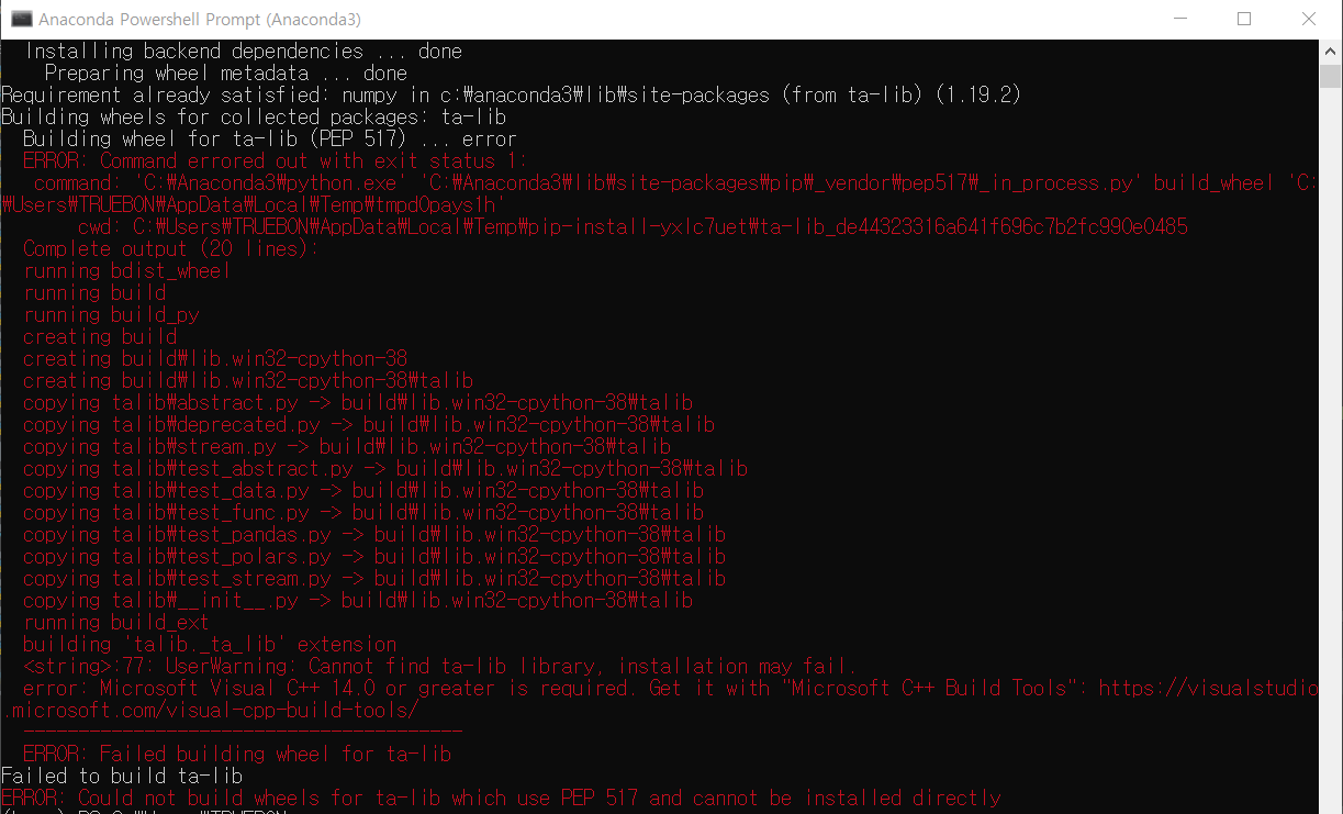 비주얼스튜디오 설치 없이 윈도우에서 Ta-Lib를 설치하려고 할경우