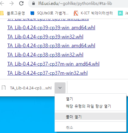 https://www.lfd.uci.edu/~gohlke/pythonlibs/#ta-lib 에서 파이썬 버전에 맞는 Ta-lib 다운로드