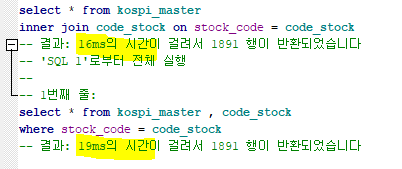 묵시적 조인과 Inner Join 조회해본결과 Inner Join이 더 빠르게 조회되었네요